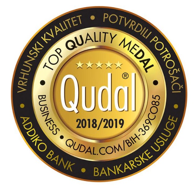 Addiko banka dobitnik je zlatne medalje za vrhunski kvalitet – “QUDAL – QUALITY meDAL“ za najviši nivo kvaliteta bankarskih usluga. QUDAL je švicarski certifikacijski program koji na tržištu detektira i nagrađuje proizvode, usluge i druge subjekte na temelju naučnog tržišnog istraživanja, koristeći inovativnu metodu DEEPMA (Deep Mind Awareness).