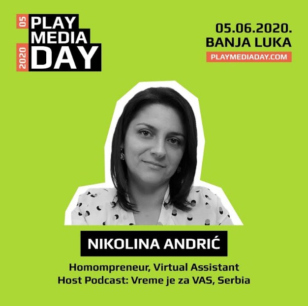 Nikolina Andrić je homompreneur – majka, koja razvija svoj biznis online od kuće. Autorka je tromjesečnog online programa „Vakademija“, koji pomaže ženama da postanu virtuelne asistentkinje. Do sada je promijenila živote više od 100 žena, koje su prošle kroz program i pronašle svoje mjesto u online svijetu. Njen ultimativni cilj je da pokaže drugim ženama da je moguće da imaju oboje – i porodicu i karijeru, te da ih podrži na tom putu. Autorka je podkasta „Vreme je za Vas“, a 2019. godine je bila polaznica Digital Course Academy, gdje je izabrana za affiliate partnerku čuvene Amy Porterfield, svjetske stručnjakinje za marketing. Na ovogodišnjoj Play Media Day online konferenciji će podijeliti svoje iskustvo, koje je stekla proteklih godina kao homompreneur.