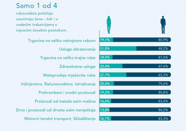 Kada je riječ o industrijama, ističe se jedan trend. U gotovo svim ispitanim zemljama, kod jedne ili više industrija koje se prema stereotipima smatraju ženskima, žene zaista i jesu većinski zastupljene na rukovodećim položajima: usluge obrazovanja, socijalne službe, zdravstvene usluge, hrana i piće i trgovine hranom. Uporedba s prvih pet sektora kompanija koja pretežno vode muškarci također pokazuje da ti sektori ne zauzimaju jedno od vodećih mjesta ni u jednoj od zemalja koje su analizirane.