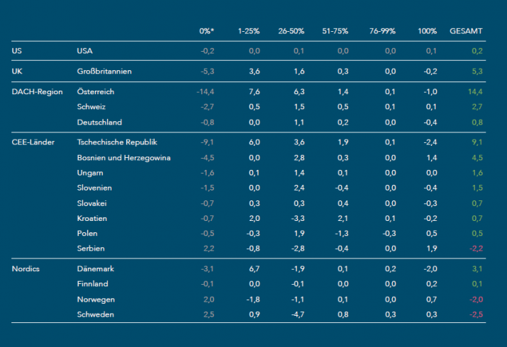 Prosječna promjena u postocima za sve evropske zemlje uključene u istraživanje prikazana je u donjoj tabeli koja pokazuje da je ukupan prosjek +2,3%, što nas dovodi do generalnog zaključka da je udio žena na menadžerskim položajima u porastu – ali se promjene i dalje sporo odvijaju. Ipak, Bosna i Hercegovina je na 4 mjestu u ovom poretku, nakon UK, Austrije i Češke Republike.