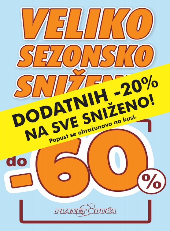 Od 24.01. kreće veliki DODATNI POPUST u najvećem maloprodajnom lancu obuće „Planet obuća” širom Bosne i Hercegovine. Na veliko sezonsko sniženje do 60%, „Planet obuća” odobrava DODATNI POPUST -20 % NA SVU SNIŽENU ROBU i to prilikom kupovine bilo kojeg artikla koji se nalazi na sniženju.