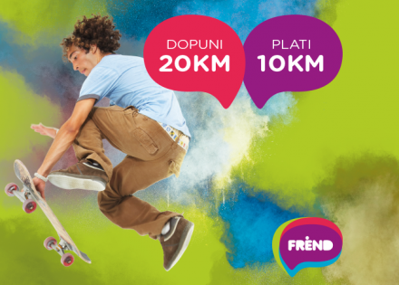 Ukoliko je tvoj izbor dopuna od 20 KM, zahvaljujući ovoj FREND-ovskoj ponudi platićeš je samo 10 KM, a na svom računu ćeš na raspolaganju imati 20 KM. Tako je i sa svim ostalim elektronskim dopunama iznad 20 KM. Dopunu od 30, platićeš 15 KM, a za dopunu od 50 KM treba da izdvojiš samo pola od toga, tj. 25 KM.