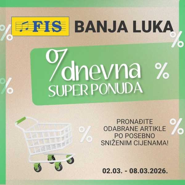 FIS Banja Luka u okviru „Sedmodnevne super ponude“ donosi izuzetne akcijske cijene odabranih proizvoda iz asortimana ishrane i hemije, kućnih potrepština i tehnike, tekstila i obuće, namještaja, opreme za kupatilo te programa za uređenje kuće i bašte.