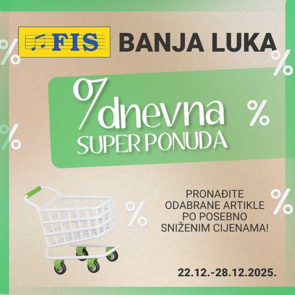 “Sedmodnevna super ponuda“ svake sedmice kupcima u prodajnom centru FIS u Banjaluci donosi izvrsne popuste na veliki broj proizvoda iz asortimana prehrane i hemije, kućnih potrepština i igračaka, odjeće i obuće, audiovideo i bijele tehnike, namještaja, opreme za kupatilo, alata te programa za uređenje kuće i vrta.