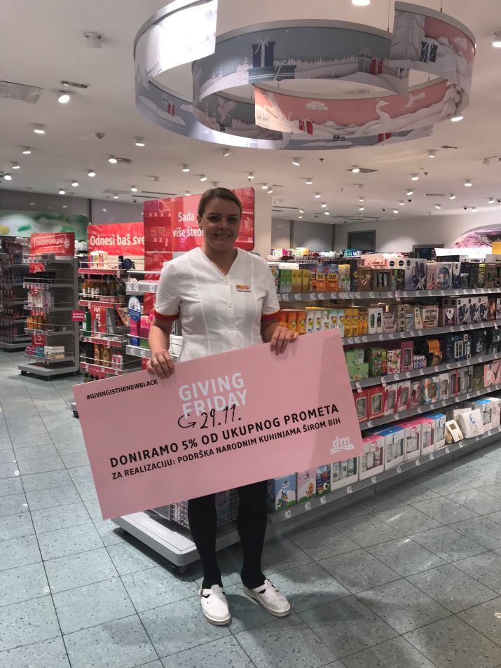 „Ove godine odlučili smo 5% prometa ostvarenog na Giving Friday, zahvaljujući našim kupcima, donirati za pripremanje obroka korisnicima narodnih kuhinja. Pod motom #givingisthenewblack želimo ovom danu dati novi smisao i poručiti kako kupovina može imati i svoju humanu stranu te da zajedno možemo činiti dobre stvari za našu zajednicu“ – izjavila je Admira Isaković, članica Uprave dm-a.