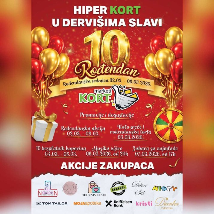 Hiper Kort u Dervišima obilježava veliki jubilej – 10 godina uspješnog poslovanja, povjerenja kupaca i zajedničkog rasta! Tim povodom, od 02. do 08. marta 2026. godine, pripremljena je rođendanska sedmica ispunjena akcijama, nagradama i bogatim zabavnim programom za sve generacije.