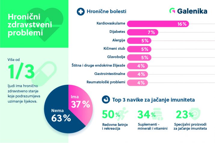 Više od 1/3 (37%) ispitanika navodi da ima hronično stanje za čije liječenje su neophodni lijekovi. Najzastupljeniji su kardiovaskularni problemi (srčani i/ili bolesti krvnih sudova). Alergije su česte, kao i metabolička/endokrina stanja i stanja povezana s hroničnim bolovima.