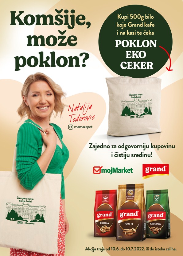 Grand kafa je u saradnji sa kompanijom mojMarket u Banjaluci odlučila nagraditi vjernost svojih potrošača. Svi ljubitelji Grand kafe koji kupe 500gr bilo koje Grand kafe u mojMarket prodavnicama, mogu odmah preuzeti Eko ceker koji ih čeka na kasi. Ova akcija traje u periodu od 10.06. do 10.07.2022. godine, odnosno do isteka zaliha poklona.
