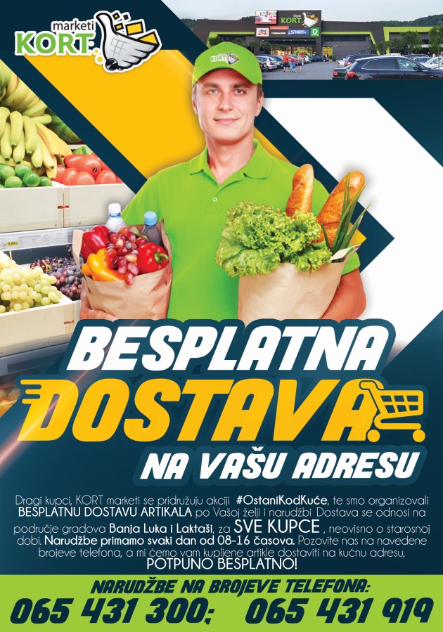 “Odlučili smo se na ovaj korak, prije svega iz solidarnosti prema našim starijim kupcima, a onda i svim drugim koji bez prijeke potrebe ne žele da napuštaju svoje domove. Vršimo sve mjere preventive kako bismo zaštitili svoje kupce, ali i naše vrijedne radnike i kaserke koje, i pored nezavidne situacije u kojoj smo se svi zajedno našli, i dalje vrijedno i požrtvovano rade da bi naši kupci imali na policama sve što su navikli da pronađu u našim marketima. Da bi ove mjere bile što učinkovitije, jedan od načina jeste i ovaj, a to je dostava na kućnu adresu, gdje se automatski smanjuje broj kupaca u marketima. A odlučili smo da dostavu vršimo potpuno besplatno, za sve starosne kategorije, na teritoriji gradova Banjaluka i Laktaši. Kupci će potrepštine dobiti po redovnim maloprodajnim cijenama, uredno upakovane, sa originalnim fiskalnim računom”, poručili su iz marketing službe KORT marketa.
