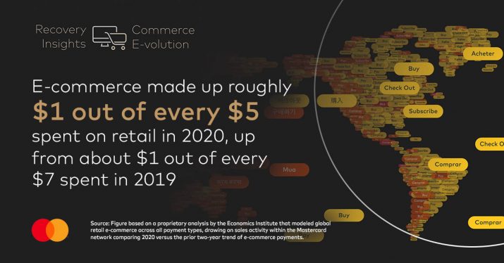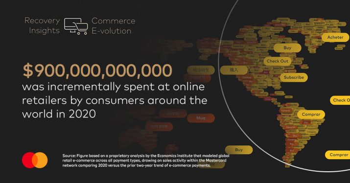 Kako su zbog Covid-19 pandemije potrošači širom svijeta ostali kod kuće, gotovo sve, od namirnica do vrtlarskih potrepština, kupovalo se online. Prema najnovijem izvještaju Mastercard Recovery Insights, to je rezultiralo sa dodatnih 900 milijardi dolara potrošenih u maloprodaji širom svijeta tokom 2020. godine. Drugim riječima: udio e-trgovine je 2020. iznosio približno 1 dolar od svakih 5 dolara potrošenih u maloprodaji, u odnosu na oko 1 dolar od svakih 7 potrošenih tokom 2019.