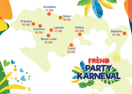 „Frend Party tim“ koji će predvoditi karneval u posebno opremljenim vozilima zaustaviće se na popularnim kupalištima i bazenima, gdje će za prisutne biti upriličena dobra zabava uz DJ-eve, jedinstvena i zabavna takmičenja na otvorenom i vrijedni pokloni za pobjednike neobičnih karnevalskih izazova. Tako će posjetioci imati priliku da se oprobaju u igrama poput šutiranja na koš, ples sa hulahopom, limbo ples (prolazak ispod letvice), igru u parovima sa zastavama i balonima, a najsrećnije očekuju i neobični pokloni.