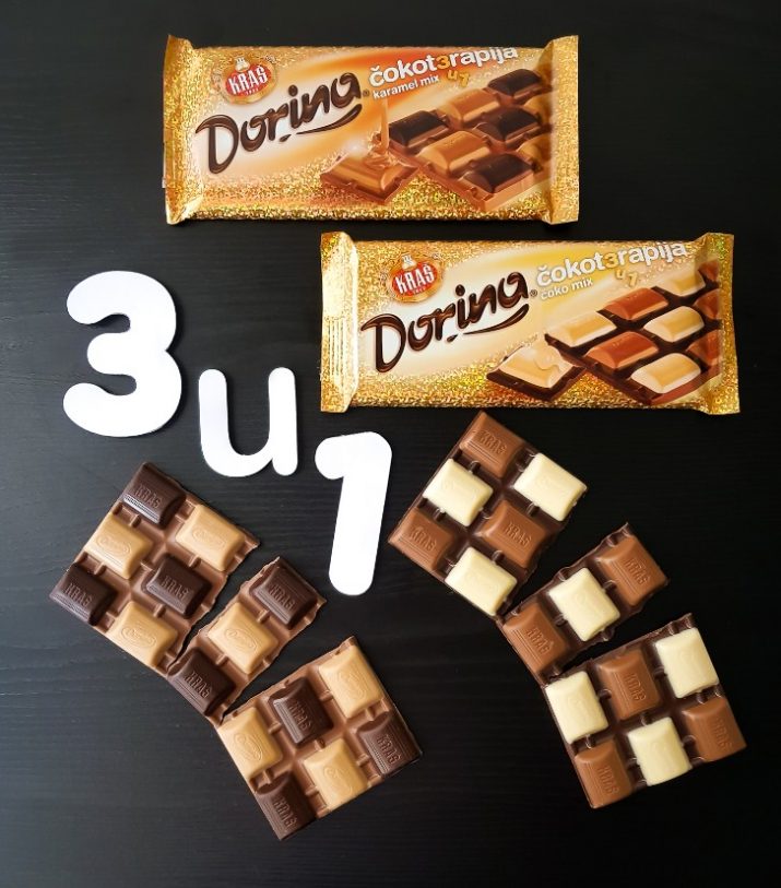 Dorina čokoterapija 3u1 – karamel mix ima dno od fino topive mliječne čokolade obogaćene lješnjak pastom i kockice od tamne i bijele čokolade s karamelom. Dorina čokoterapija 3u1 – čoko mix ima dno od tamne čokolade s većim udjelom kakaa, a na površini se izmjenjuju kockice od bijele i mliječne čokolade.