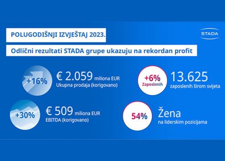 STADA Grupa nastavila je da bilježi dvocifrenu prodaju i rast profita i tokom prve polovine 2023. Najbolji polugodišnji rezultati ikada ostvareni su odličnim performansama u tri STADINA strateška poslovna segmenta: zdravstveni proizvodi široke potrošnje, generički proizvodi i specijaliteti. Svi regioni doprinijeli su razvoju prodaje i profita.