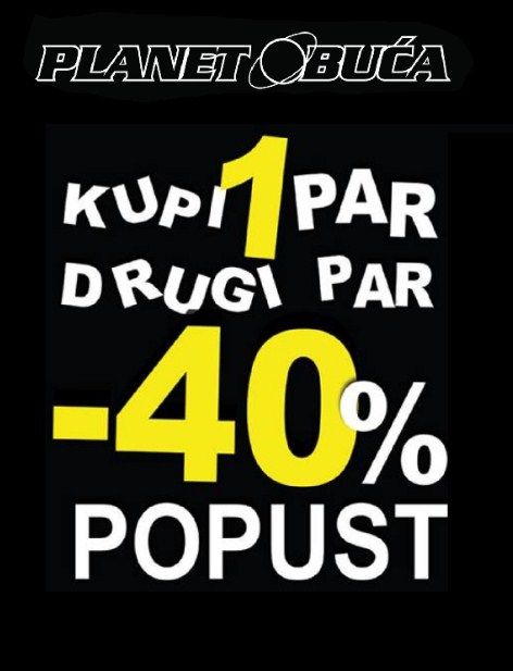 Od 11.09.2020. godine, “Planet obuća” svim svojim kupcima, prilikom kupovine jednog para odobrava -40% popusta na drugi par, što znači da kupac kod odabira 2 para obuće ili dva komada druge robe u trgovini skuplju plaća, a na drugu jeftiniju ili iste vrijednosti se odobrava -40% popusta.