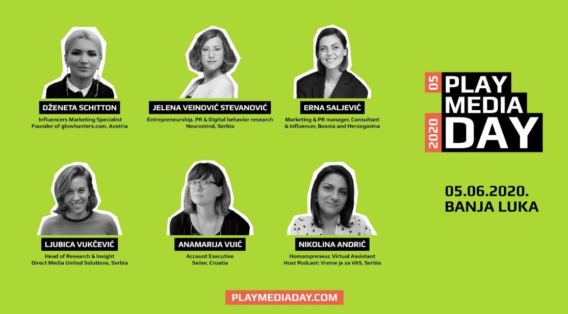 Veliki peti regionalni komunikacijski događaj, Play Media Day, održaće se za tačno tri mjeseca, 5. juna 2020. godine, na već dobro poznatoj lokaciji, u Cinestar 4DX Delta Planet Banja Luka. Ovaj put donosimo imena 6 novih potvrđenih predavačica na konferenciji, koja će od Banjaluke na jedan dan napraviti grad, koji predvodi regionalnu kreativnu industriju. Nimalo slučajno, u susret 8. martu, predstavljamo 6 moćnih, uspješnih i snažnih žena, koje će na Play Media Day-u, kroz svoje životne primjere pokazati, moć žena u svijetu kreativne industrije.