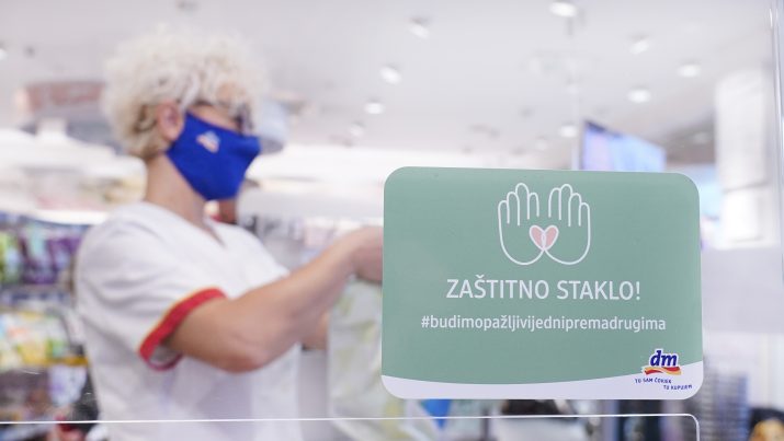 U cilju zaštite zaposlenih i kupaca, već krajem februara kompanija dm formirala je tim za praćenje situacije uzrokovane pandemijom. U novoj organizaciji rada, u okviru protekle poslovne godine doneseno je niz odluka i mjera, koje se primjenjuju i danas. Sprovodi se rad u smjenama uz minimalan kontakt zaposlenih, vrši potpuna dezinfekcija radnog prostora, a za kupce je osigurana zaštita.