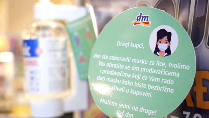 Tako svi kupci koji u dm prodavnicu dođu bez zaštitne maske, od dm prodavača mogu zatražiti besplatnu, na raspolaganju su sredstva za dezinfekciju ruku i obuće, a tu su i oznake za održavanje distance.