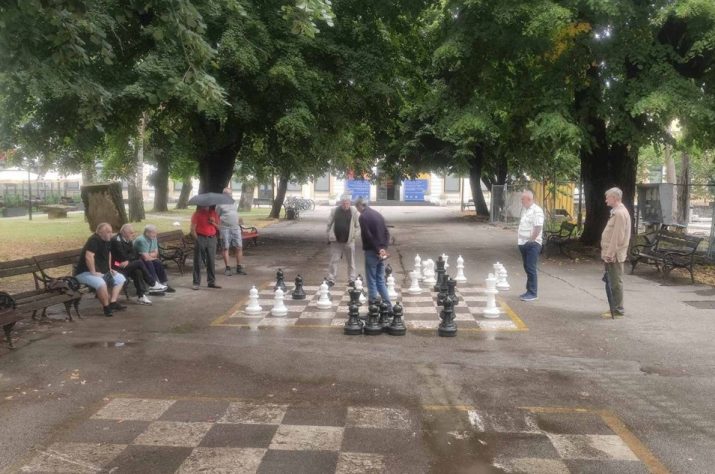 Strastvene banjalučke amaterske šahiste ni današnja jaka kiša nije omela u tome da uživaju u ovoj plemenitoj misaonoj igri kod Muzeja savremene umjetnosti Republike Srpske.