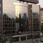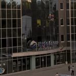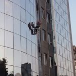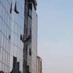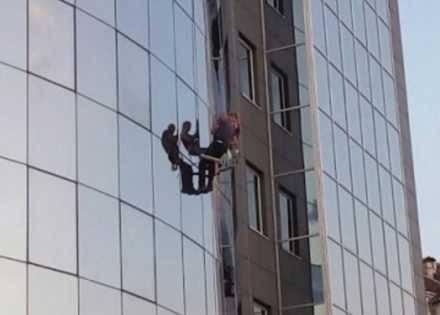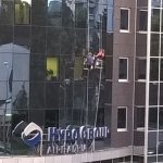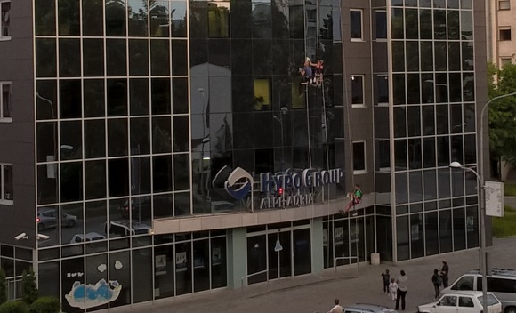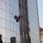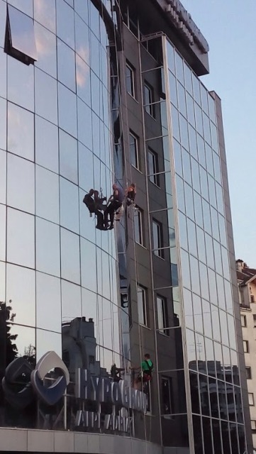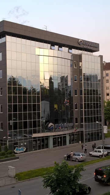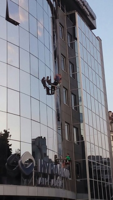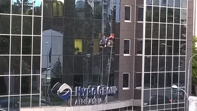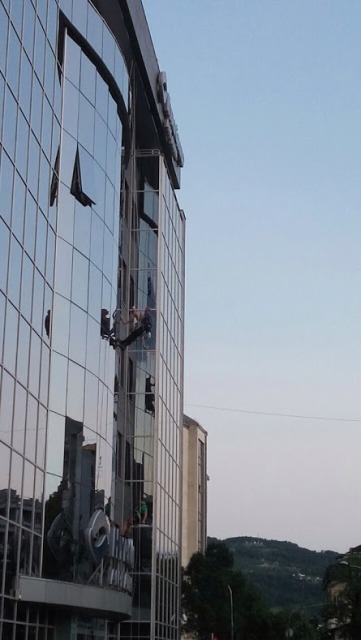 Na zgradi “Hypo Alpe Adria” banke preko puta Alternativne televizije nesvakidašnji prizor – perači prozora viseći na sajlama čiste staklenu fasadu.