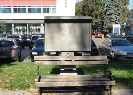 “Ovu oglasnu tablu smo platili 3369 konvertibilnih maraka (narodnih), pa se mole građani, radnici, studenti, seljaci, penzioneri, nezaposleni, itd… da se prema njoj odnose sa dužnim poštovanjem! Da ne lijepite svoje oglase na nju jer tako narušavate autentični izgled „remek djela“ izvođača radova (iz Laktaša naravno). Da imate na umu da je 3369 KM više od 10 prosječnih penzija, dvije potrošačke korpe, četiri prosječne plate I VIŠE NEGO BEZOBRAZLUK!”