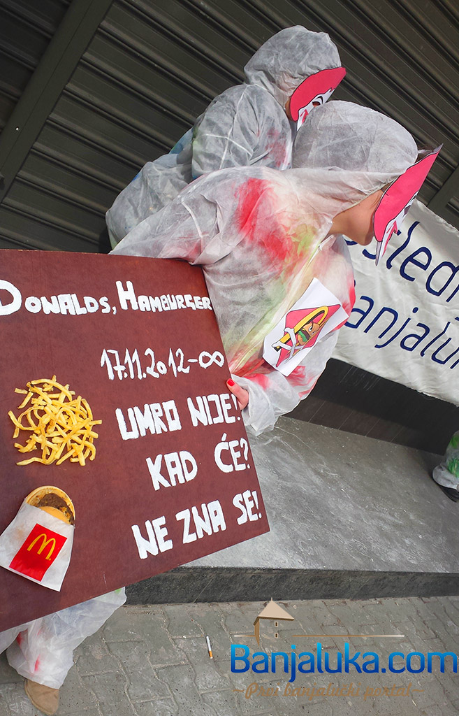 Grupa građana danas je održala akciju ispred, sada već zatvorenog McDonaldsa. Tom prilikom je predstavljen najstariji hamburger u Banjaluci koji će kao eksponat predstavljati svjedočanstvo beskonačnog trajanja, odnosno lošeg kvaliteta hrane koja se služila u McDonald'su.