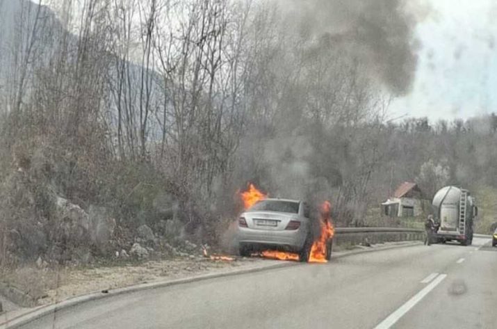 Prema fotografijama koje su zabilježene na licu mjesta, vidi se da je automobil bio zaustavljen pored puta, dok je veliki plamen zahvatio prednji dio vozila.