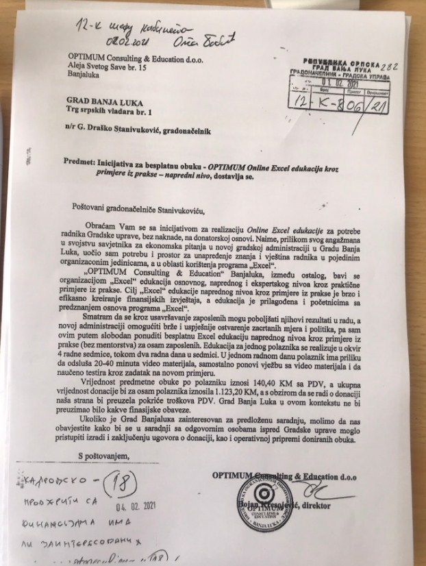 Kresojević navodi da se 1. februara firma Optimum Consulting & Education zvanično obratila Gradu Banjaluka sa inicijativom da obezbijedi besplatnu obuku iz Excel-a za 8 zaposlenih, odnosno online edukaciji, a 31. avgusta na sastanku zaposlenima u Odjeljenju za komunalne poslove saopštava da će njegova firma obezbijediti besplatnu edukaciju onima koji su zainteresovani.