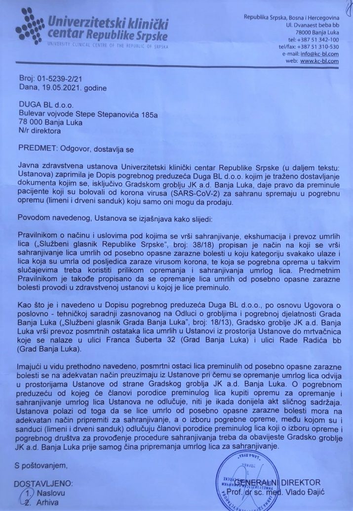 Kako bi razjasnili sve nedoumice pisali su i direktoru Univerzitetskog kliničkog centra Vladi Đajiću koji im je odgovorio da o pogrebnom preduzeću kod kojeg će članovi porodice kupiti pogrebnu opremu oni ne odlučuju niti su ikada donijeli akt o tome.