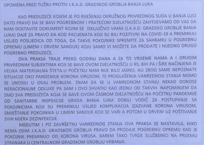 CAPITAL je u posjedu opomene pred tužbu koju je pogrebno preduzeće „Duga“ poslalo Gradskom groblju, a u kojem traže odštetu zbog toga što su ih u proteklom periodu ostavili bez posla i otjerali u gubitak.