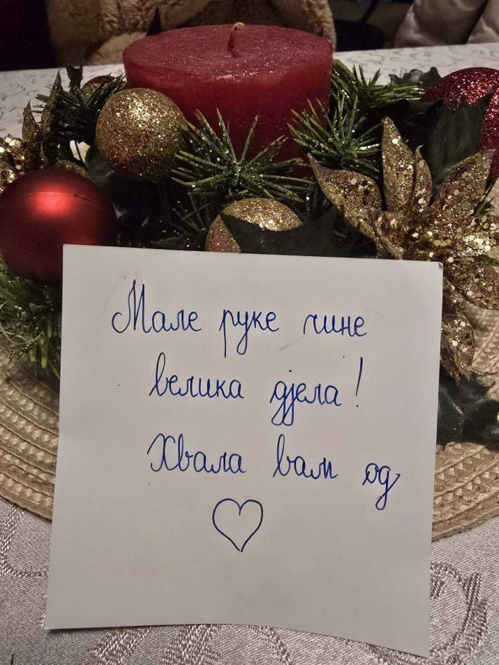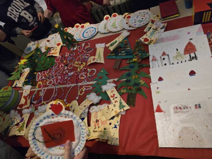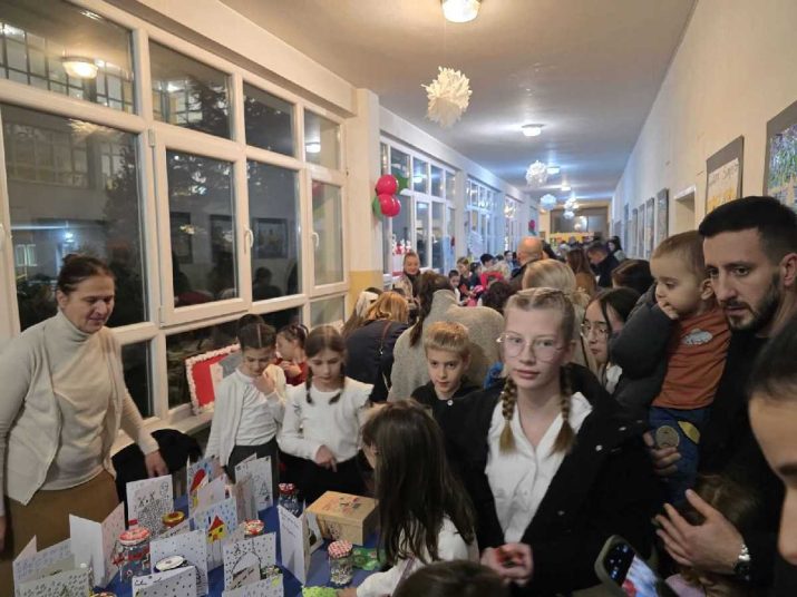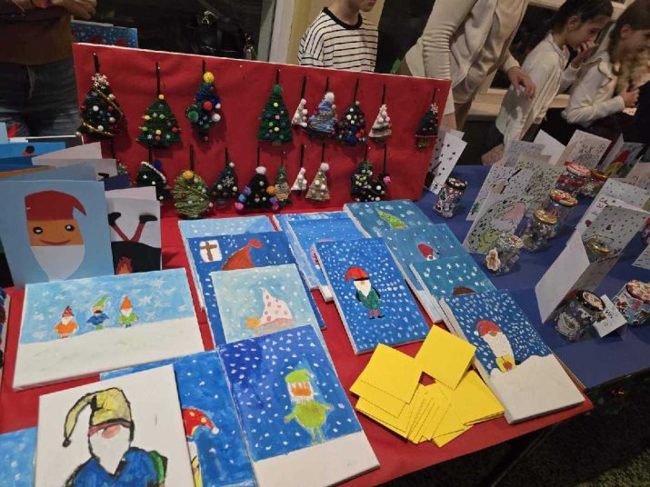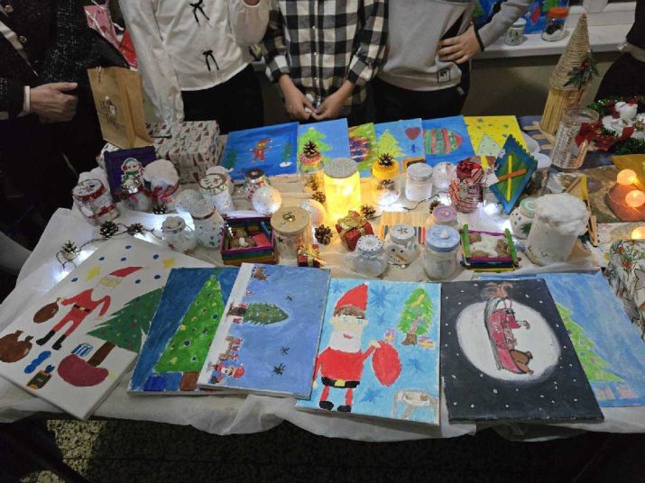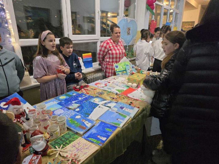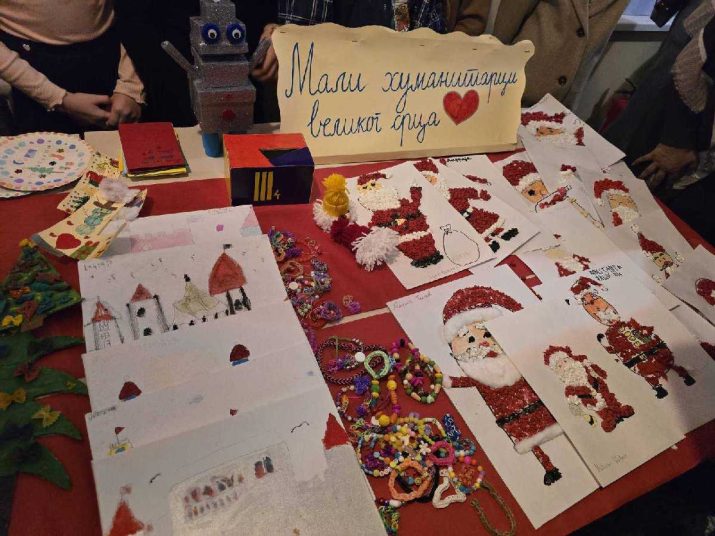 Na štandovima su se mogle naći rukotvorine i prigodni pokloni koje su izradili sami učenici – novogodišnje čestitke, ukrasi u obliku jelki, male slikarske podloge i platna sa zimskim motivima, privesci, narukvice od perlica, te dekorisane staklene tegle sa slatkišima.