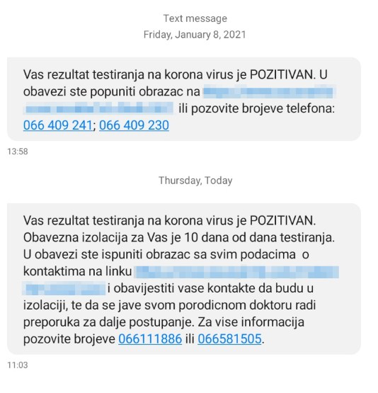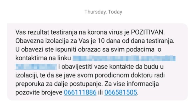 Dakle, ako je rezultat testiranja pozitivan, putem SMS poruke se pacijent obavještava o rezultatu testiranja. U prilogu SMS poruke se nalazi Web obrazac, koji pacijent popunjava odgovarajućim podacima. Ukoliko je test negativan, pacijentu stiže poruka o negativnom rezultatu testa, bez Web obrasca, i tada ne postoji potreba za izolacijom.