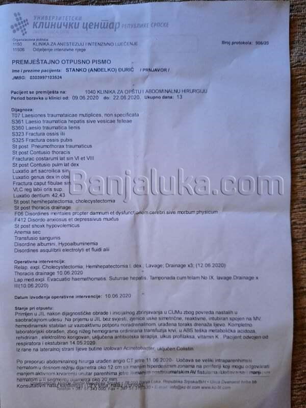 “Hospitalizovan u UKC gdje sam zadobio teške tjelesne povrede, a ponajviše jetre jer je pukla na 9 djelova i krvario sam puno. Odstranjen mi je potpuno desni režanj jetre i jedan dio lijevog, žučna kesa, imao sam pneumotoraks, prelom karličnih kostiju, koljena. Ljekari mi nisu davali šansu za preživljavanjem. Mjesec dana sam bio hospitalizovan. Primao sam svaki dan albumine koje je moja porodica plaćala 400 KM po danu jer istih nije bilo na stanju”, priča za portal banjaluka.com Stanko Đurić.