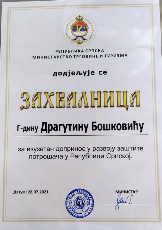 Nedavno mu je Ministrastvo trgovine i turizma RS uručilo zahvalnicu za izuzetan doprinos u razvoju zaštite potoršača u Republici Srpskoj.