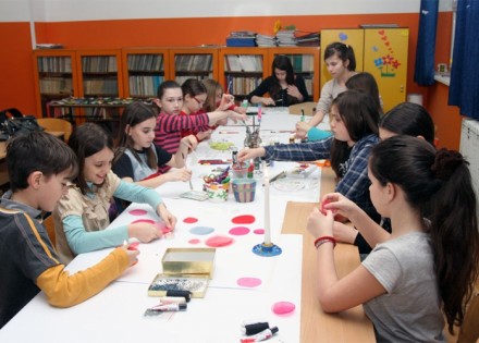 Učenica petog razreda Sandra Knežević kaže da je došla na ideju kako da od običnog materijala za zavjese napravi broš u obliku cvijeta. U holu škole nalazi se bijeli ormar u kojem se izlažu radovi tokom čitave školske godine.