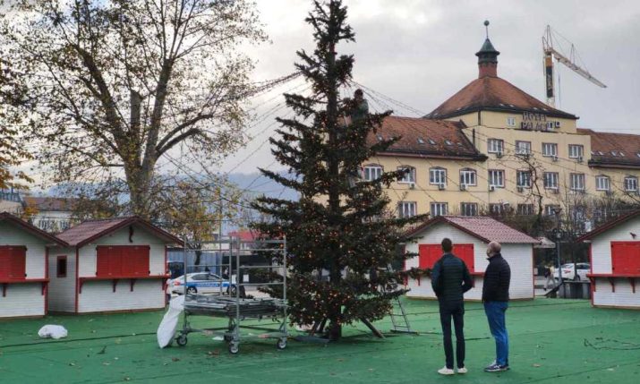 Jelka je visoka nekoliko metara a ukrašena je lampicama koje su danas zasijale.