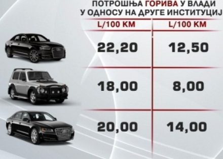 Iako je Vlada 2013. godine zaključkom odredila gornji prag od 60 hiljada, uskoro ga je ukinula, bar kad su ministarski automobili u pitanju. Ni na gorivu nisu ništa štedljiviji. Neki Vladini automobili troše od 30 do 120 odsto više nego što je uobičajeno. Zbog netačno prikazanih podataka, nepotpunih izvještaja, i bespotrebnog obnavljanja voznog parka, revizor je zaključio – službena vozila Vlade i njenih institucija ne upotrebljavaju se na ekonomičan način, i postoji prostor za značajno rezanje troškova, koji bi se mogli smanjiti za više od četvrtine.