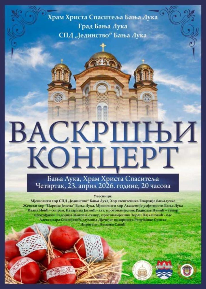 Povodom Vaskrsa, najradosnijeg hrišćanskog praznika, Srpsko pjevačko društvo Jedinstvo iz Banjaluke tradicionalno organizuje Vaskršnji koncert u četvrtak, 23. aprila sa početkom u 20.00 časova u Hramu Hrista Spasitelja.