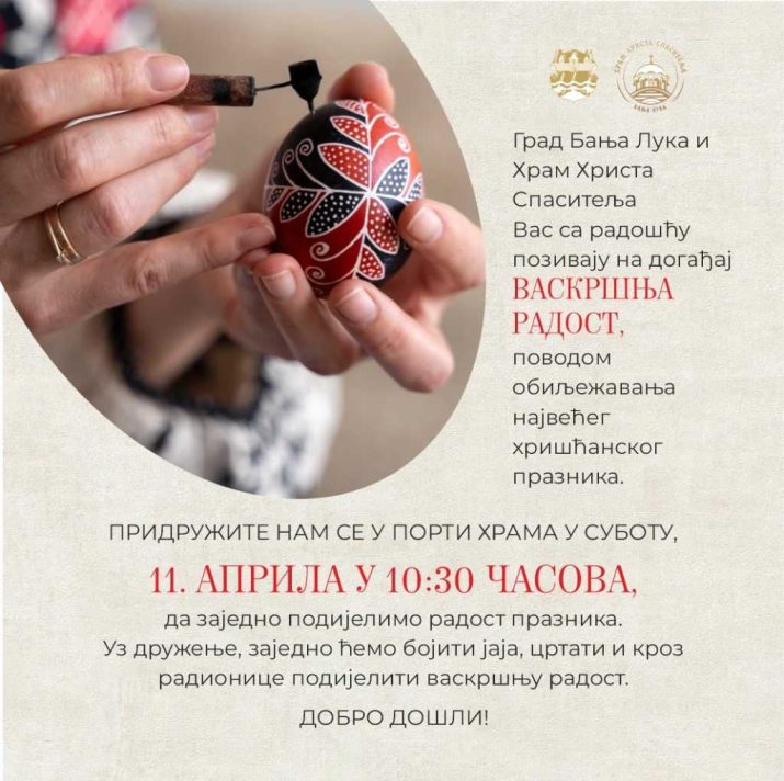 “Pridružite nam se u porti Hrama da zajedno podijelimo radost praznika. Uz druženje, zajedno ćemo bojiti jaja, crtati i kroz radionice podijeliti vaskršnju radost.”