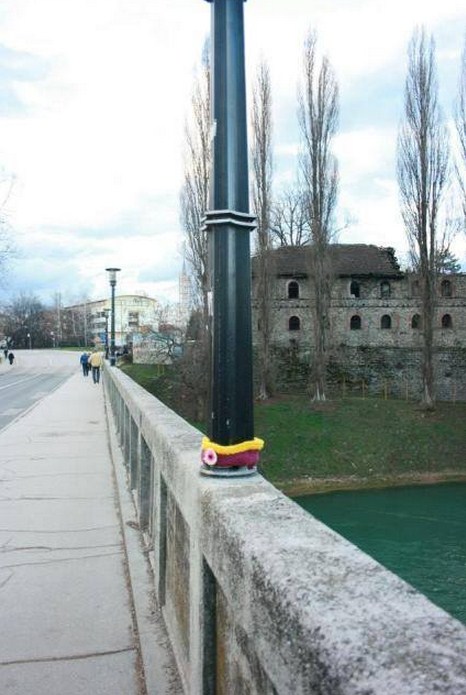 Tako je bilo sa prvim projektom, ili, možemo ga, nimalo pretenciozno, nazvati instalacijom. Bilo je to prije dvije godine, kada su na stubove gradske rasvjete na Gradskom mostu postavili pletiva. Nakon samo dva sata neko ih je skinuo.
