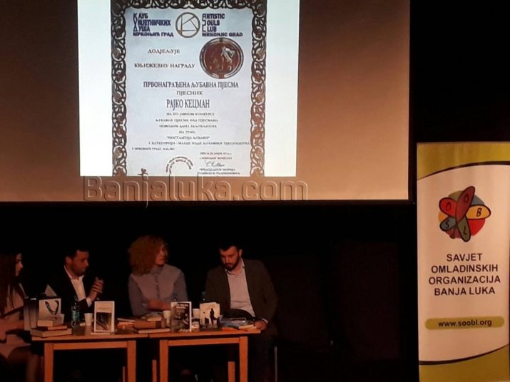 U organizaciji Savjeta omladinskih organizacija Banjaluka i Udruženja mladih književnika Banjaluka u Domu omladine sinoć je za banjalučku publiku organizovano književno veče. Ljubiteljima poezije i proze su se predstavili mladi, afirmisani književnici: Rajko Kecman, Ana Marija Pilipović, Boris Petrović i Dajana Balaban.