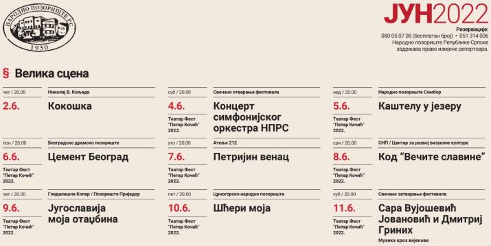 Tokom mjeseca juna očekuje vas Teatar fest „Petar Kočić“, koji vam donosi zanimljive predstave, a svečano otvaranje zakazano je za 4. jun kada će biti održan i koncert Simfonijskog orkestra Narodnog pozorišta Republike Srpske.