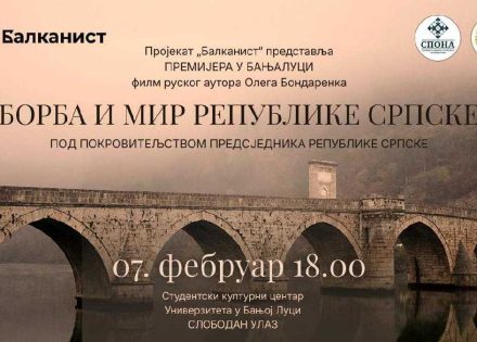 U Studentskom kulturnom centru Univerziteta u Banjaluci sutra, u subotu 7. februara, biće održana centralna premijera dokumentarnog filma “Borba i mir Republike Srpske“, ruskog autora Olega Bondarenka.