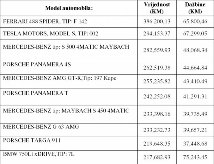 Najskuplji automobil uvezen u Bosnu i Hercegovinu u prvih devet mjeseci ove godine je ferari 488 spajder, tip F142. Ponosnog vlasnika skupocjeni četvorotočkaš koštao je 386.200,13 KM, plus dažbine od 65.800,46 KM.