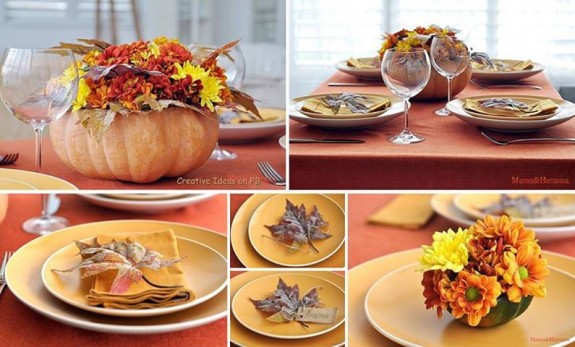 Obradujte voljenu osobu romantičnom večerom. U tanjire stavite po jednu malu tikvu i cvijetove hrizantema.