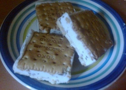 Keks na kratko utopiti u čokoladno mlijeko, pa redati u pleh. (10 keksa dole,10 gore). Umutiti sladoled, pa sipati preko keksa i izravnati. I drugu polovinu natapati u cokoladno mlijeko i naredati gore. Ostaviti u zamrzivac da se stegne. Prije svakog sjecenja noz staviti pod mlaz vruce vode, kako bi se lakse kocke isjekle.