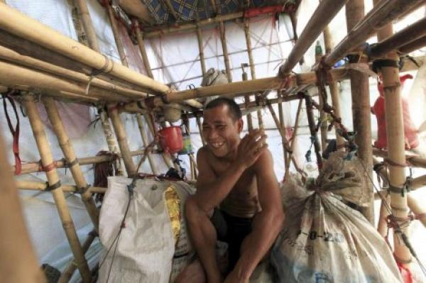 On svoje kuće, čiji je rok trajanja oko godinu dana, pravi od bambusa, plastike i prekrivača za krevet i u njima nosi šerpe i malu rernu.