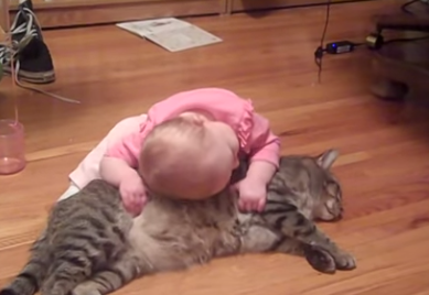 U videu malena beba uživa u društvu mace, pokušavajući je iskoristiti kao jastuk, naslonjač ili igračku. A uživa li maca?