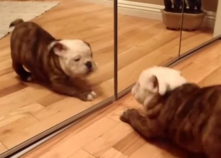 Ništa nije slađe od ovog malog engleskog buldoga koji se prvi put vidi u ogledalu.