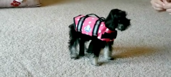 Maggie, minijaturni šnaucer, dobila je svoju prvu jaknicu za hladnije vrijeme, ali čini se da će joj trebati malo vremena da se na nju navikne.