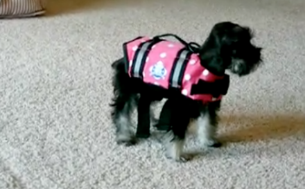 Maggie, minijaturni šnaucer, dobila je svoju prvu jaknicu za hladnije vrijeme, ali čini se da će joj trebati malo vremena da se na nju navikne.